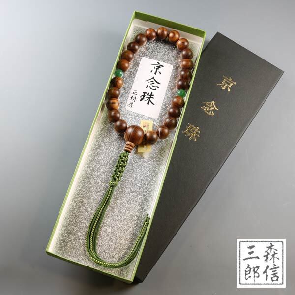 【メール便OK】浄土真宗 男性用 数珠 栴檀(センダン) 22玉 二天アベンチュリン 正絹紐房 (房色・緑)本式数珠 木製数珠 (京念珠 念誦 門徒 葬式 法事 あす楽) | 京念珠 仏具 京都・森信三郎商舗