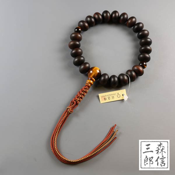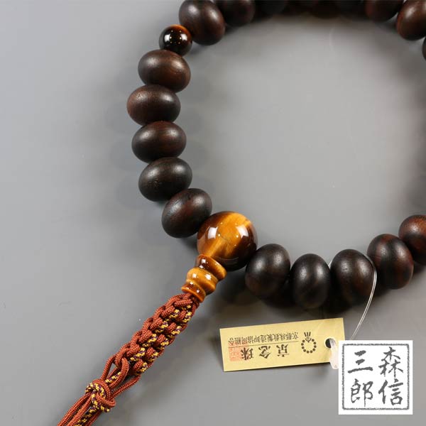【メール便OK】浄土真宗 男性用 数珠 縞黒檀 22玉 みかん玉 虎目石仕立て 正絹紐房 (房色・茶) 本式数珠 正式 (虎眼 京念珠 念誦 門徒 タイガーアイ あす楽) | 京念珠 仏具 京都・森信三郎商舗