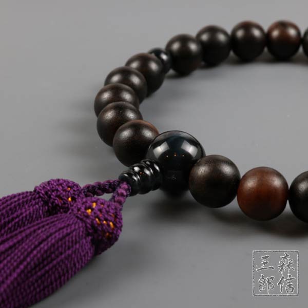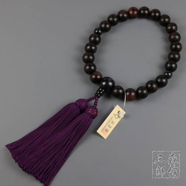 【メール便OK】男性用 数珠 縞黒檀 (艶消) 22玉 青虎目仕立 正絹房(房色・紫)