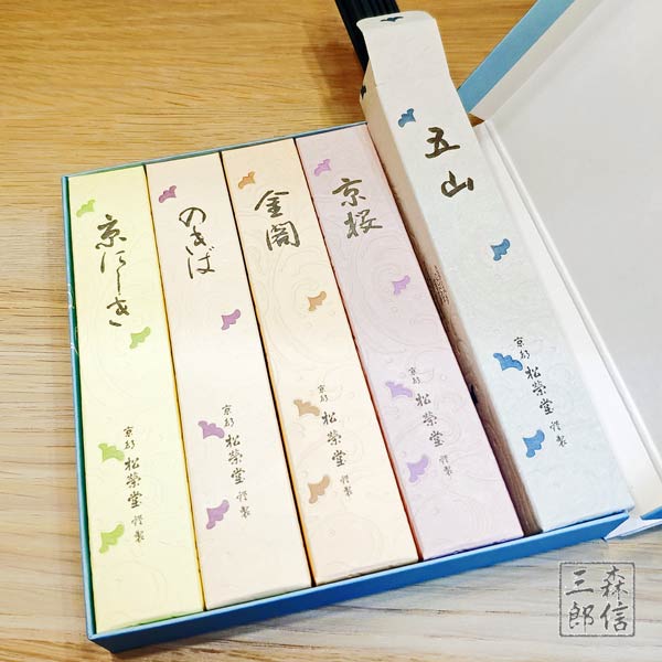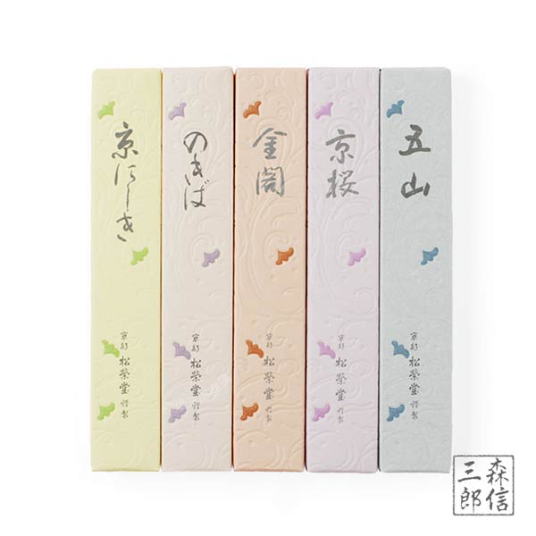 京線香のうち、五山・京桜・金閣・のきば・京にしきの小箱セットです。