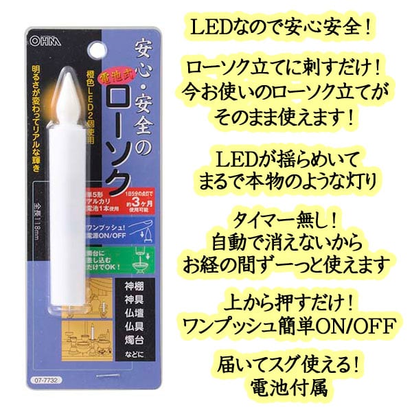 LEDローソク 電池式 全長118mm(中) (全長11.8cm 燭台なし1本入り) タイマー無し(電池式 電気 電子ローソク 蝋燭 ロウソク キャンドル OHM) | 京念珠 仏具 京都・森信三郎商舗