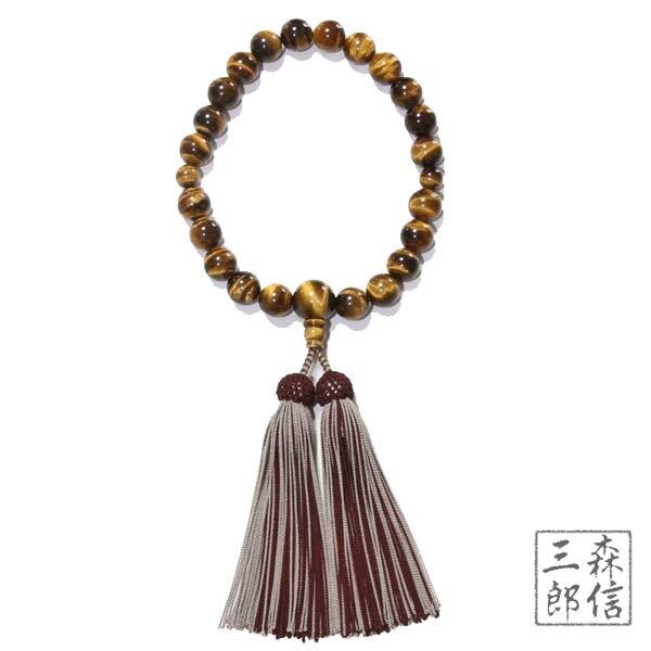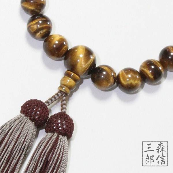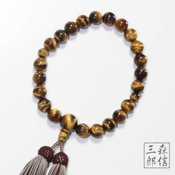 【送料無料】男性用 虎目石 12mm 22玉 片手 共仕立 正絹房(房色・こげ茶/薄ネズ茶) ( トラメ タイガーアイ 虎眼 京念珠 略式数珠 念誦 天然石 葬式 法要) | 京念珠 仏具 京都・森信三郎商舗